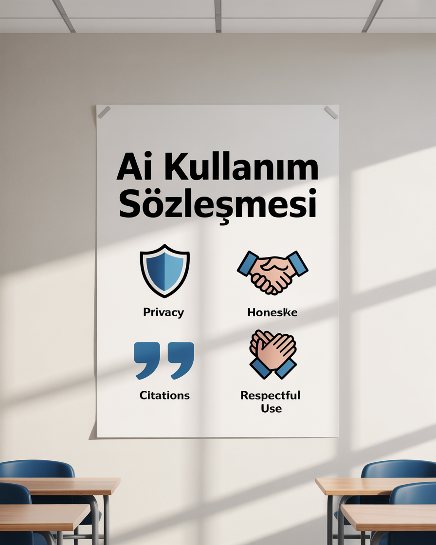 AI okuryazarlığının kalbi etik ve güvenliktir. TYMM’de etik; “yasak” değil “doğru kullanım standardı”dır. Sınıf sözleşmesine şu maddeleri ekleyin:
